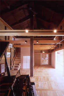 倉敷の旧大橋家の蔵を、建築家の楢村徹氏が設計し、移築再生したホールは、土間式の縁側が付いた開放的な設計で、四季の移り変わり、静かな雨音、小鳥のさえずり等と共に音楽を楽しむ独自の空間となっています。